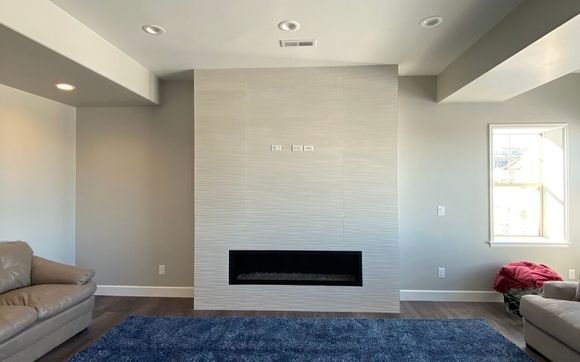 Wavy Porcelain Tile On The Fireplace Surround Up To The Ceiling By Expert Touch Tiling In Thornton Co Alignable